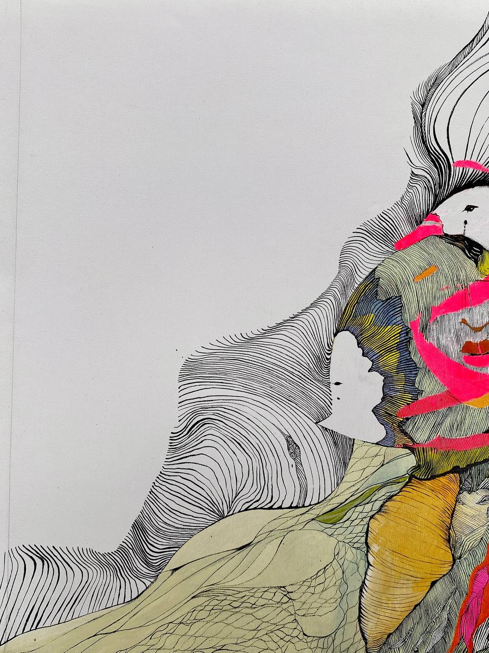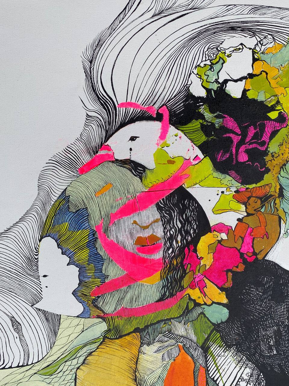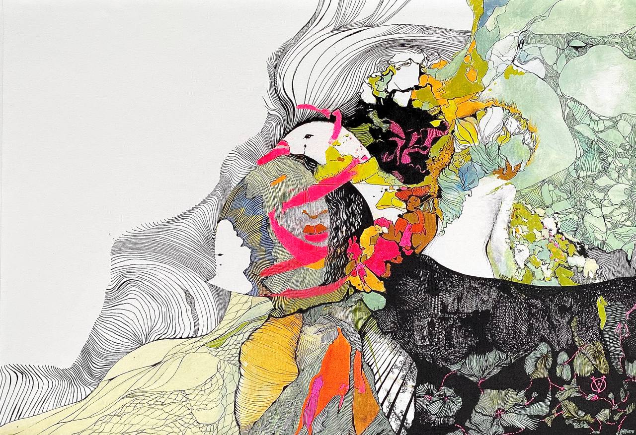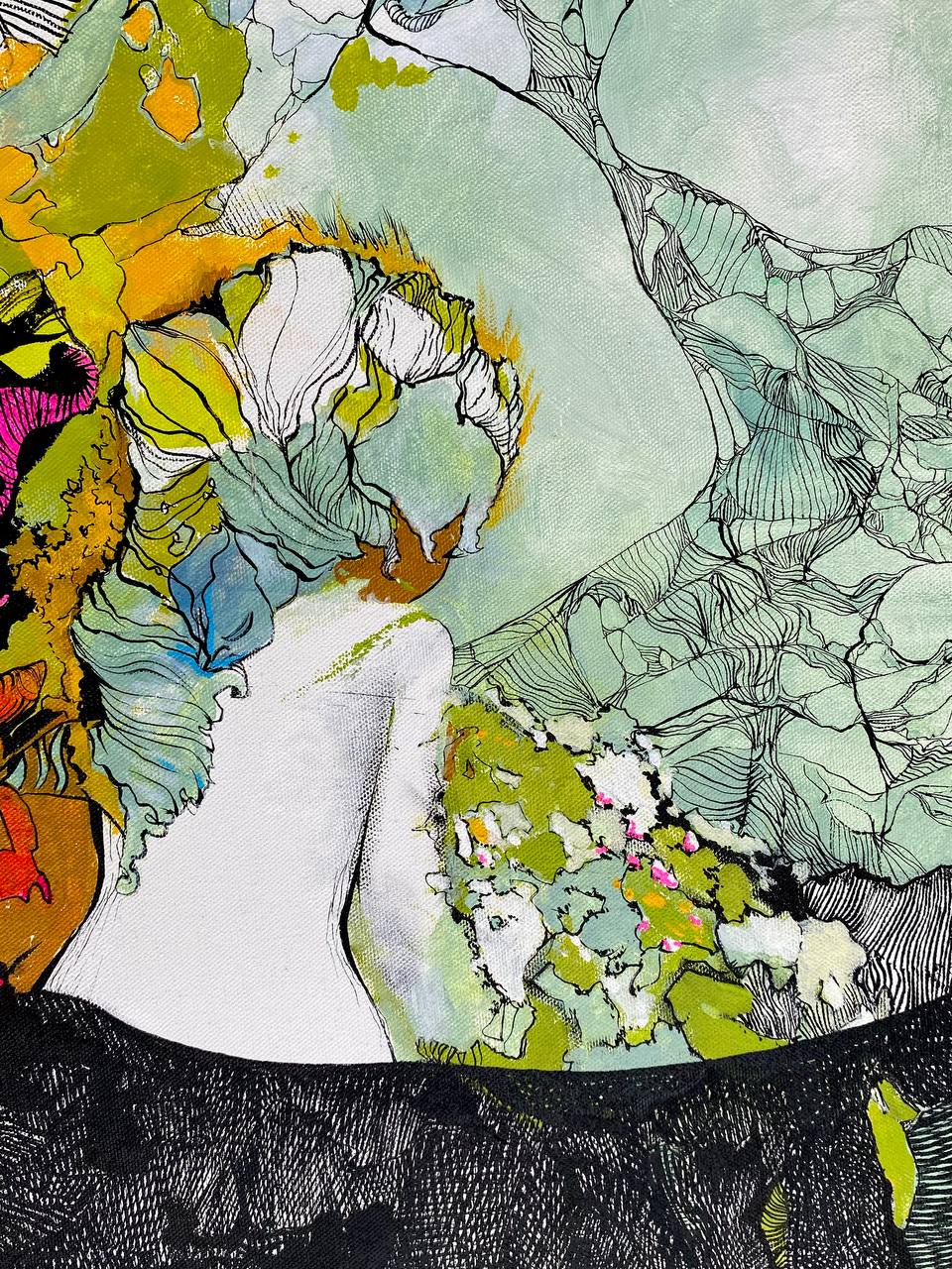 Unusual companions have gathered around her: a bright fish glides smoothly nearby, a goose with extravagant plumage watches what is happening with curiosity, and in the distance a dragon majestically spreads its wings, adding an element of power and magic.