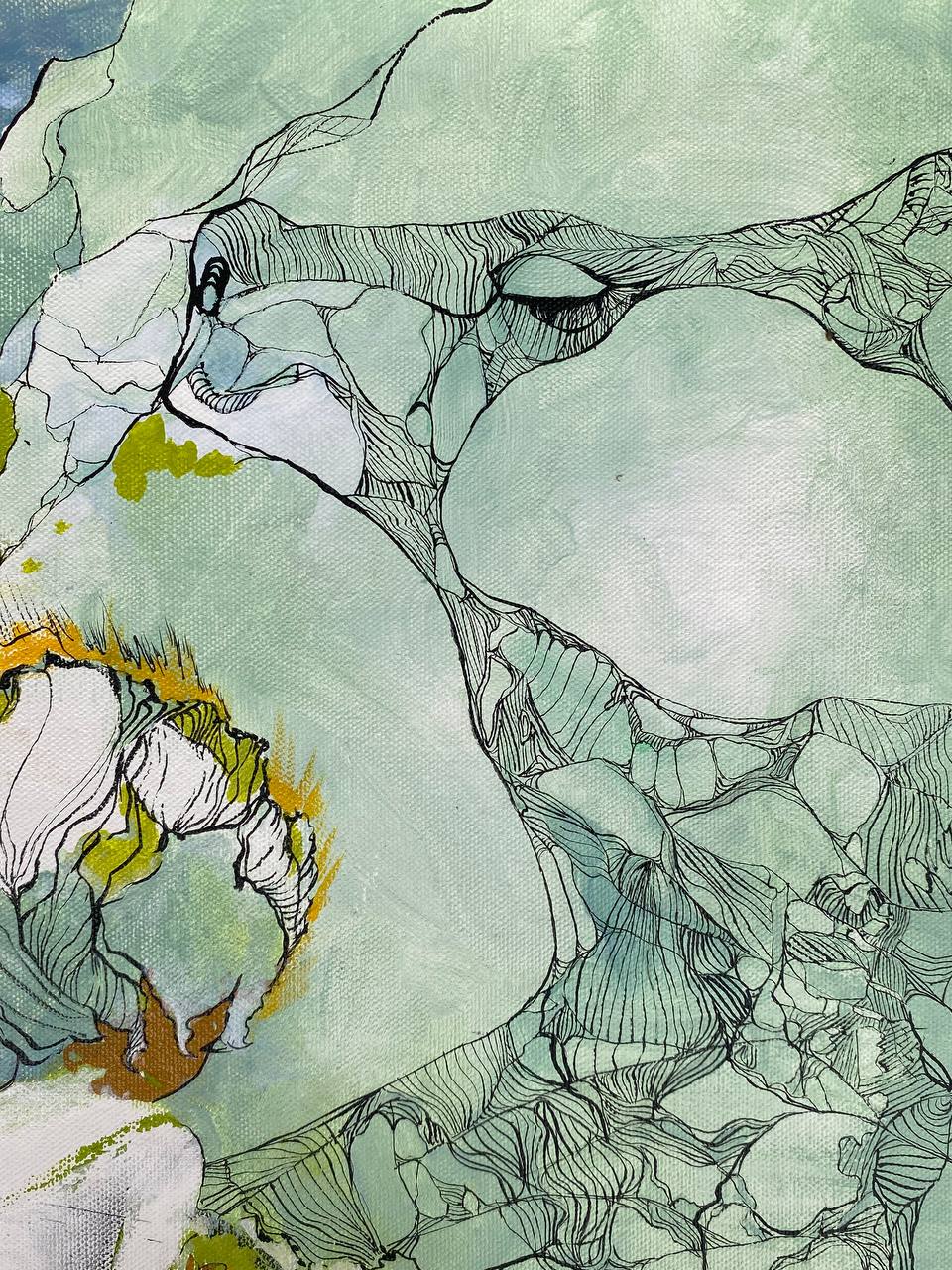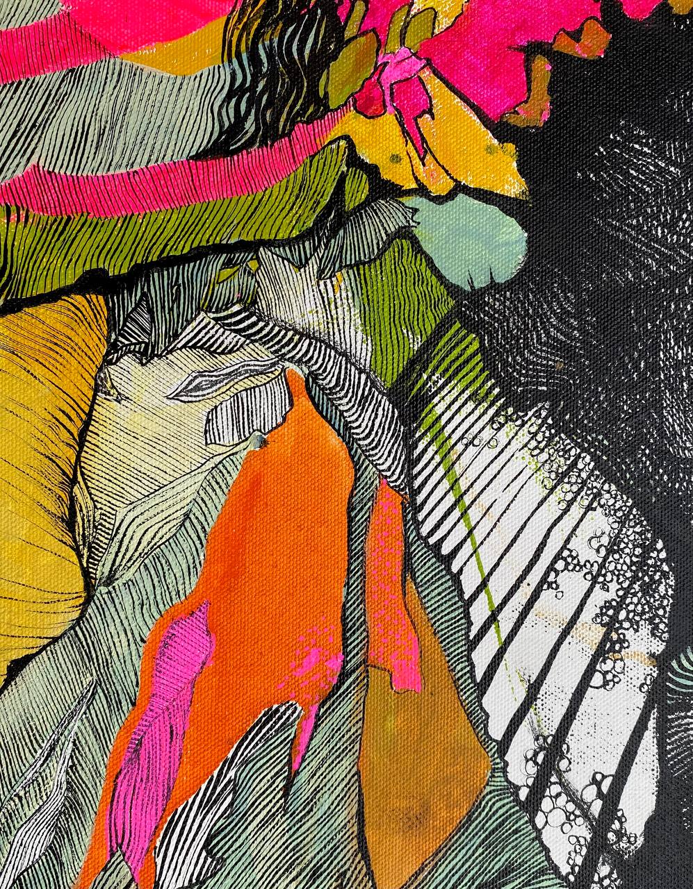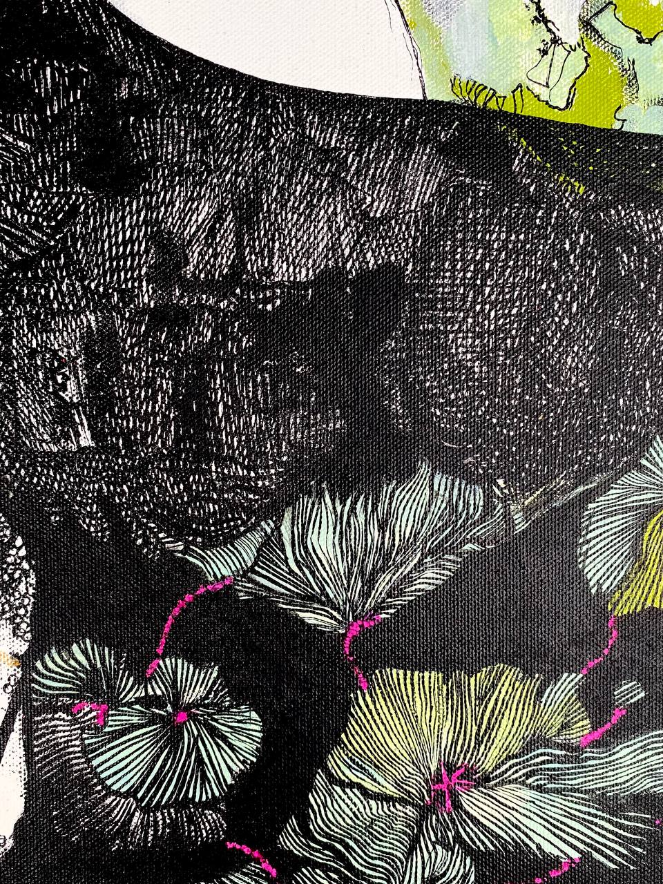 Unusual companions have gathered around her: a bright fish glides smoothly nearby, a goose with extravagant plumage watches what is happening with curiosity, and in the distance a dragon majestically spreads its wings, adding an element of power and magic.